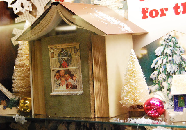 This was a fun project I did at work one day and I know those who love vintage finds will enjoy seeing the finished product. Challenged with creating a holiday-themed display case that would seem right at home at a library, I began my search on Pinterest for inspiration. I was initially going to use my collection of miniature glitter houses and refer to holiday decor books, but then I found a bird house made out of books and the creative light bulb went on!